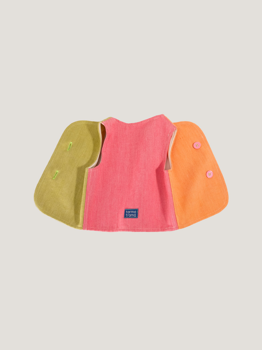 Il davanti è diviso: arancione tramonto a destra, verde pistacchio a sinistra. Il retro è lampone e le tasche lo riprendono.