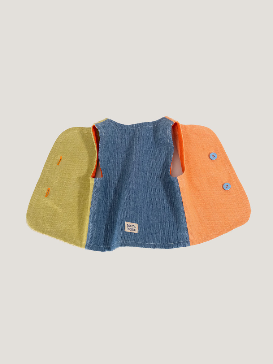 Il davanti è diviso: arancione tramonto a destra, verde pistacchio a sinistra. Il retro è blu mare e le tasche lo riprendono.