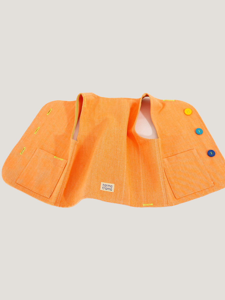 Questo è un gilet leggero e solido, color arancione tramonto con i bottoni giallo, azzurro e blu a contrasto.