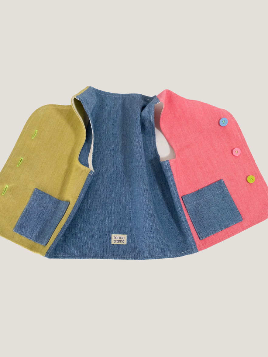 Il davanti è diviso: lampone a destra, verde pistacchio a sinistra. Il retro è blu mare e le tasche lo riprendono.