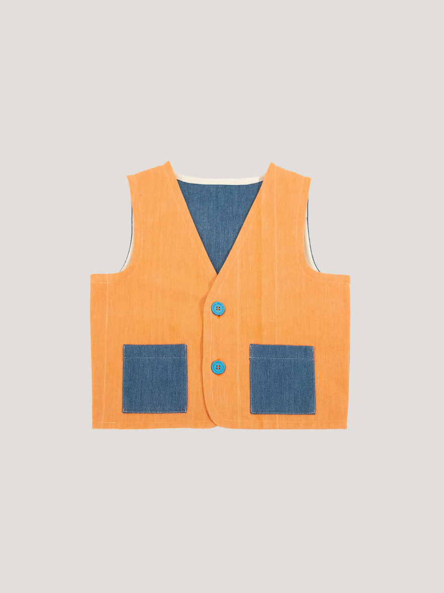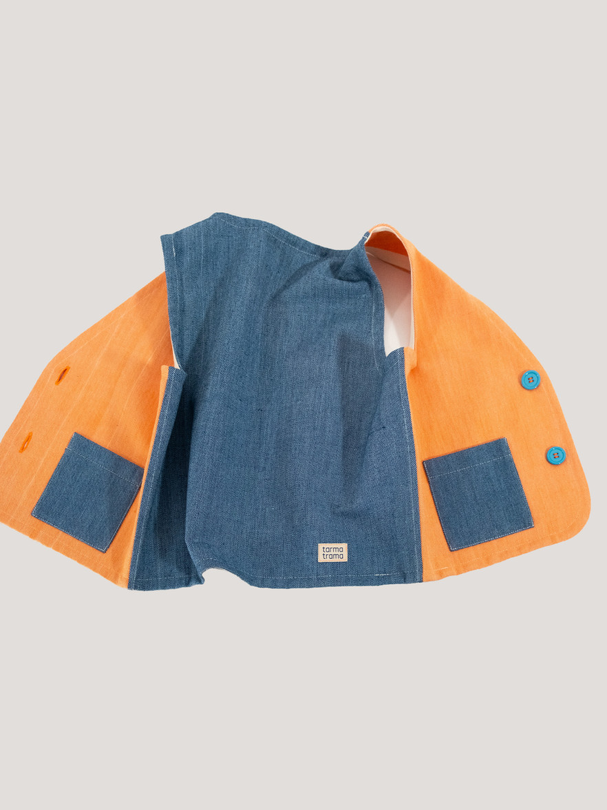 Forma crop, colore doppio. Il fronte è arancione tramonto, il retro blu mare e le tasche riprendono il colore del retro, creando un equilibrio che si legge solo guardandolo bene.