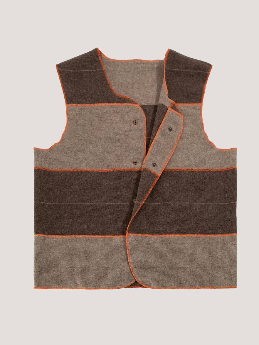 Il gilet Felice prende vita dal ridimensionamento artigianale di un intero lotto di plaid: un gesto di recupero consapevole che trasforma fibre pregiate in un nuovo compagno di avventure quotidiane.