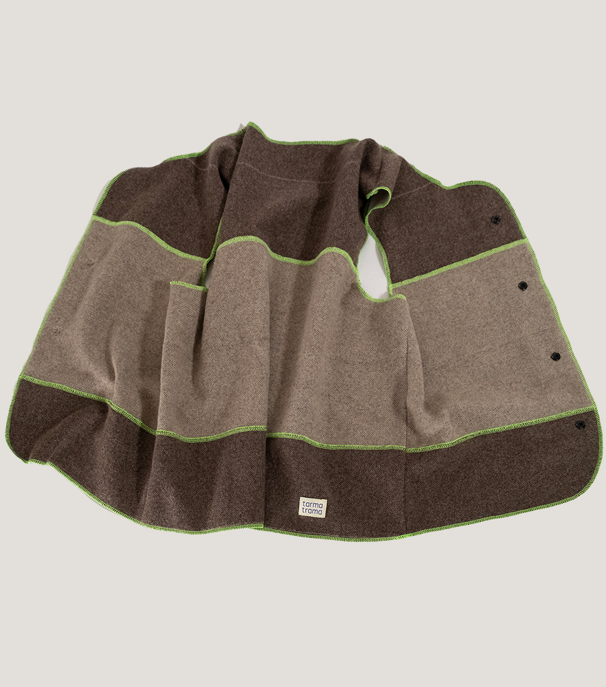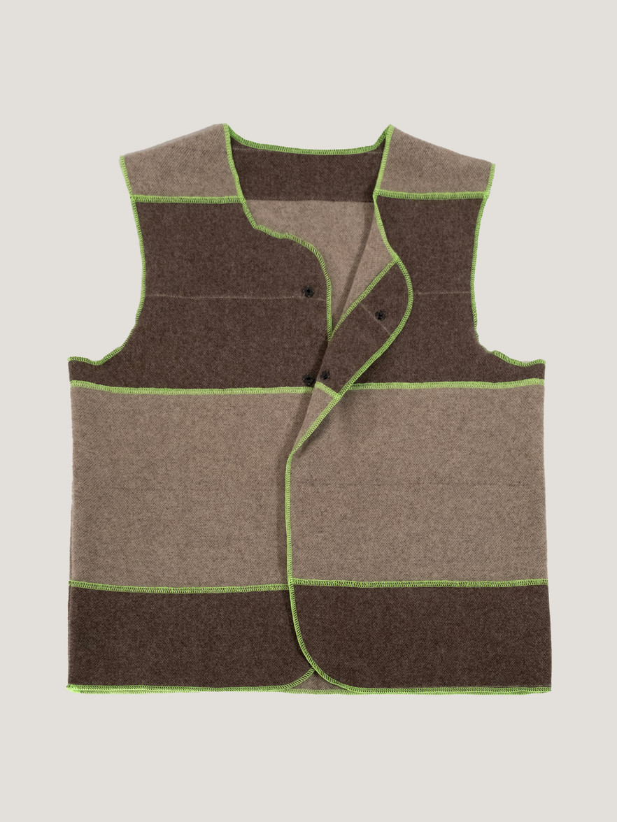 Il gilet Felice prende vita dal ridimensionamento artigianale di un intero lotto di plaid: un gesto di recupero consapevole che trasforma fibre pregiate in un nuovo compagno di avventure quotidiane.